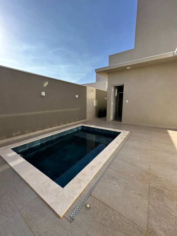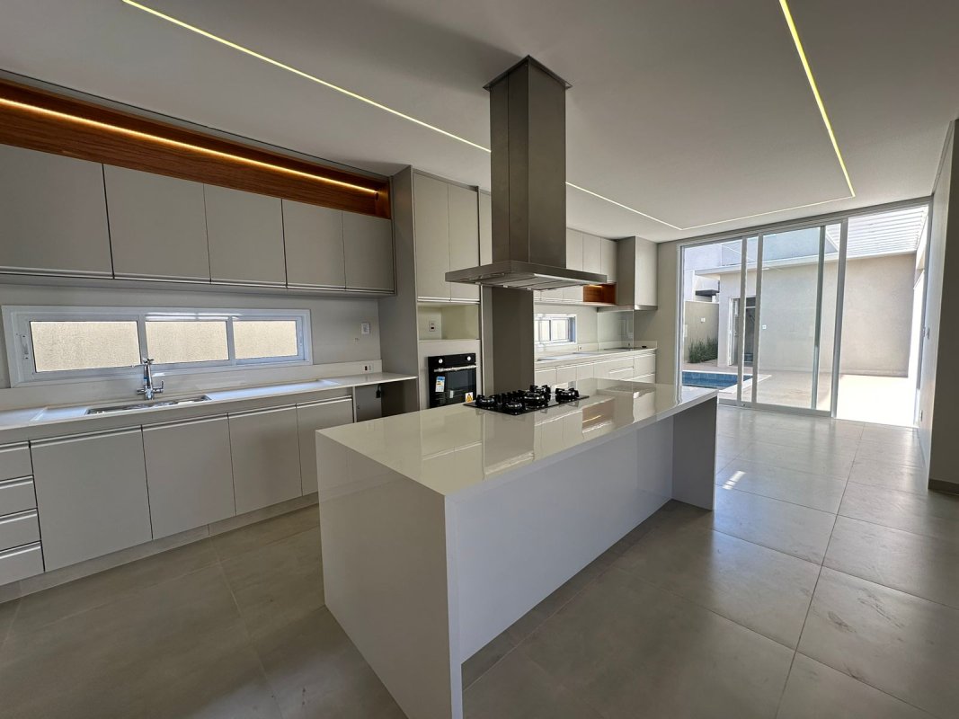 Casa térrea, com 3 suítes,Closet, lavabo mais banheiro externo. Aquecedor solar, piscina aquecida, Sala integrada, com pé direito duplo, lavanderia com dispensa, repleta em armários, iluminação de led, louças e metais Docol, quartinho para materiais e armário externo. Paisagismo e preparação para fotovoltaico.