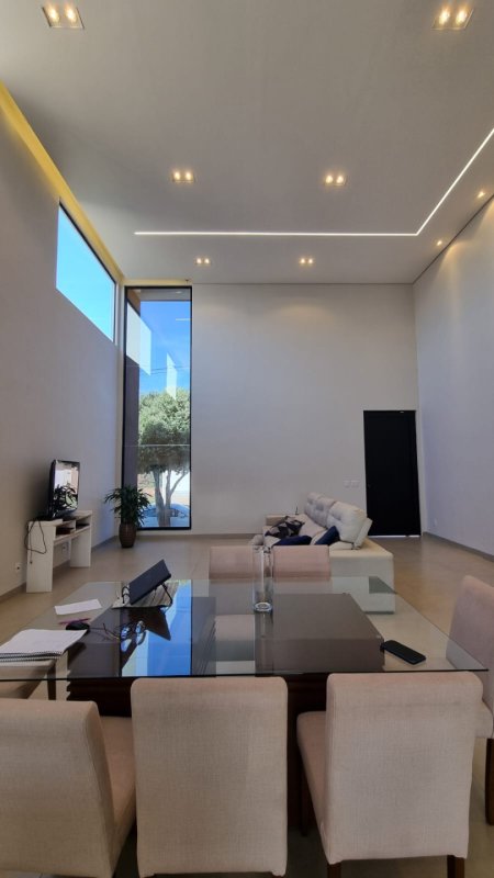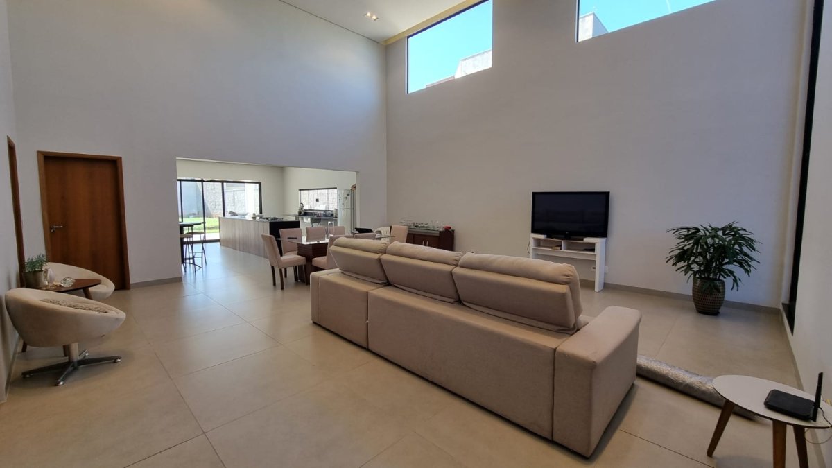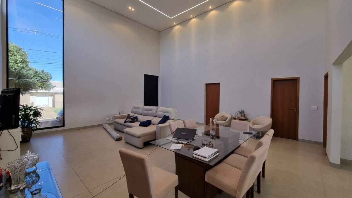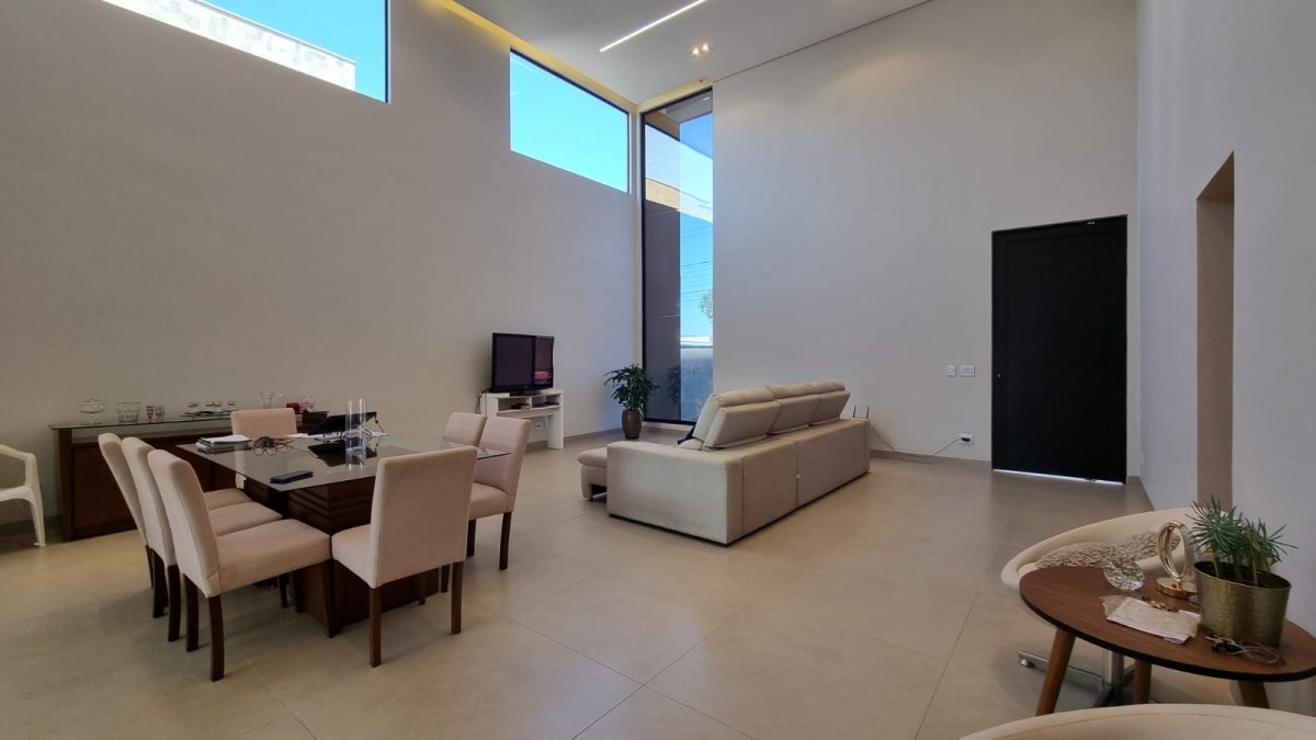 Sala ampla com pé direito duplo proporcionando excelente iluminação e ventilação