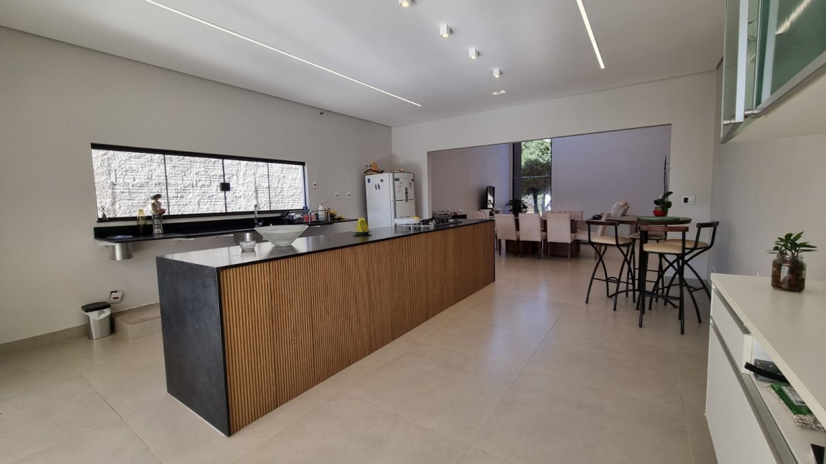 Cozinha integrada com ilha central de 4,80 m equipada com cooktop ideal para receber amigos e familiares